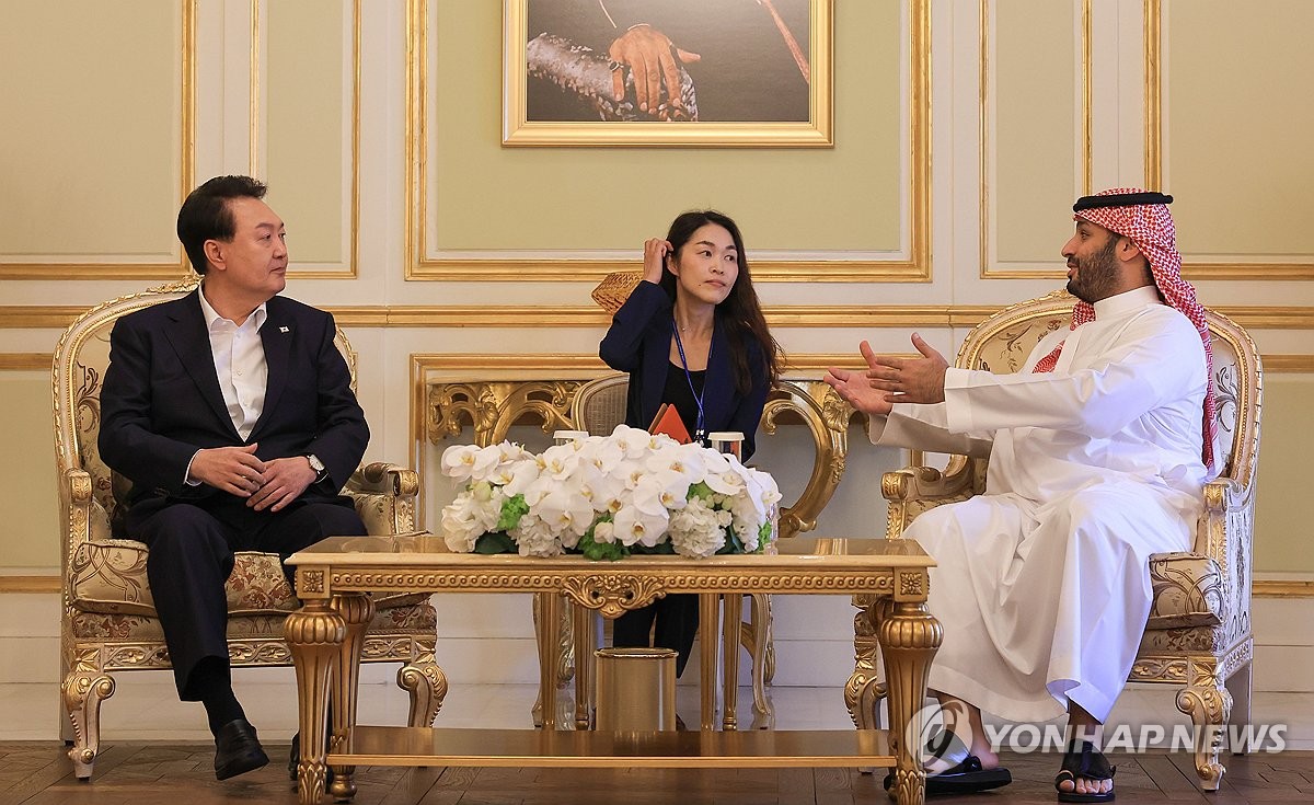 (리야드=연합뉴스) 임헌정 기자 = 윤석열 대통령이 24일(현지시간) 사우디아라비아 리야드 영빈관을 방문한 빈 살만 사우디 왕세자와 환담하고 있다. 윤 대통령과 빈 살만 왕세자는 환담 후 미래 투자 이니셔티브 포럼 대담 행사장으로 함께 이동했다. 2023.10.24 [공동취재] kane@yna.co.kr