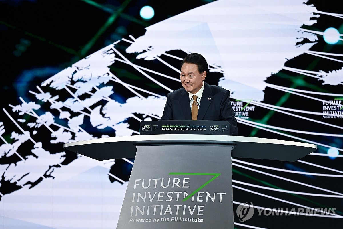 (리야드=연합뉴스) 임헌정 기자 = 사우디아라비아를 국빈 방문 중인 윤석열 대통령이 24일(현지시간) 리야드의 킹 압둘아지즈 국제 콘퍼런스 센터(KAICC)에서 열린 미래 투자 이니셔티브 포럼 대담에서 미소짓고 있다. 2023.10.25 [공동취재] kane@yna.co.kr