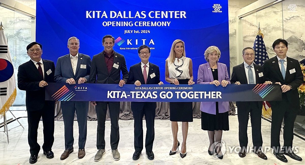 (서울=연합뉴스) 1일(현지시간) 미국 텍사스주 한국무역협회 댈러스 사무소 개소식에서 도광헌 주댈러스 영사출장소 소장(왼쪽부터), 존 먼스 텍사스 플레이노 시장, 리치 맥코믹 조지아 하원의원, 윤진식 한국무역협회 회장, 베스 반 다인 텍사스 하원의원, 제인 넬슨 텍사스주 국무장관, 정영호 주휴스턴 총영사, 김경훈 한국무역협회 댈러스 사무소장이 기념 촬영하고 있다. 2024.7.2 [한국무역협회 제공. 재판매 및 DB 금지]