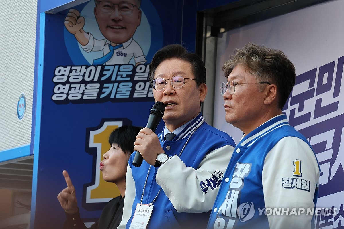 (서울·영광=연합뉴스) 박경준 계승현 기자 = 더불어민주당 이재명 대표가 이틀 연속 전남 영광군에서 장세일 영광군수 재선거 후보 지원 유세에 나서는 등 텃밭 사수에 총력을 기울이고 있다.