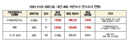 한편, 조국혁신당 박은정 의원은 지난 대선 기간에 이뤄진 국내 대선 관련 여론조사를 전수조사한 결과 미래한국연구소와 협력사 PNR은 평균 조사일 수가 1∼2일로 다른 ARS 조사업체 평균인 2.13일보다 낮은데도 응답률은 2.7∼2.9%포인트 높았다며 조작 여론조사 가능성을 수사해야 한다고 주장했다.