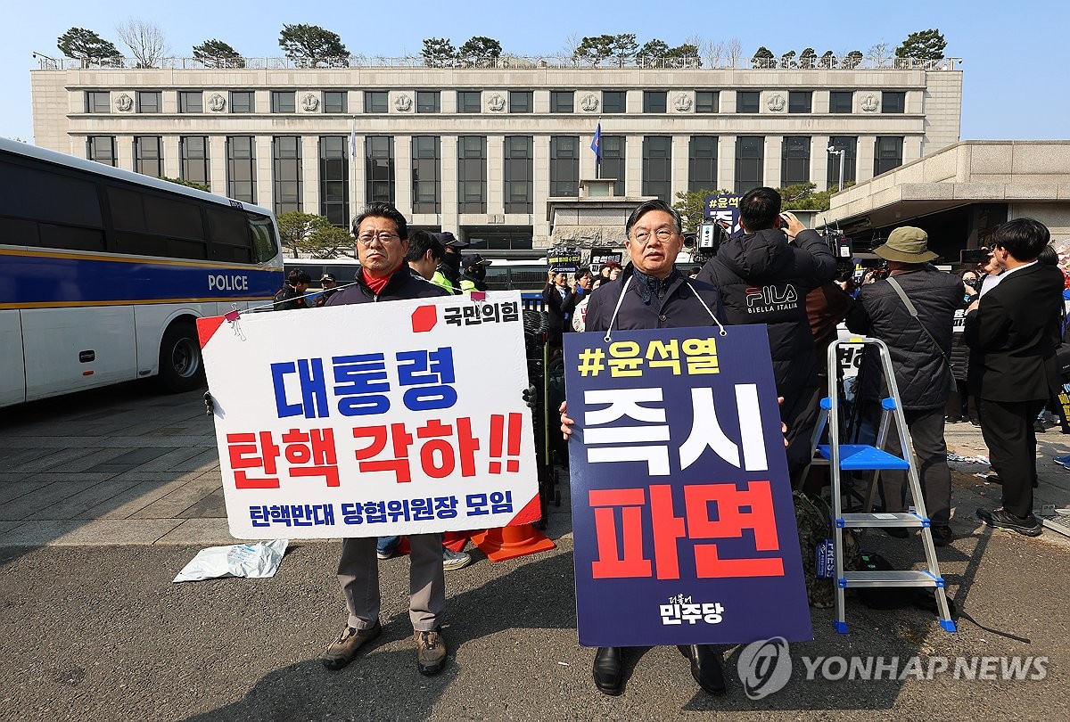 (서울=연합뉴스) 김도훈 기자 = 21일 서울 종로구 헌법재판소 앞에서 더불어민주당 김윤 의원(오른쪽)과 국민의힘 수원시을 홍윤오 당협위원장이 각각 윤석열 대통령 파면 촉구 및 탄핵 반대 1인 시위를 하고 있다. 2025.3.21 superdoo82@yna.co.kr