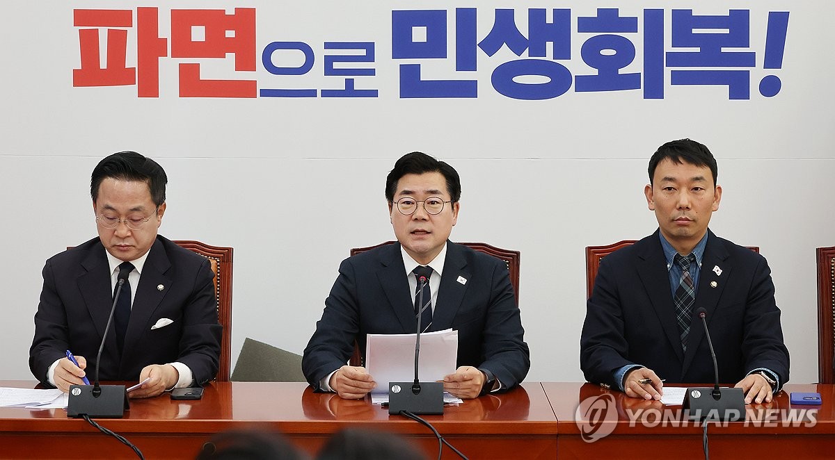 (서울=연합뉴스) 김주형 기자 = 더불어민주당 박찬대 원내대표(가운데)가 23일 국회에서 열린 기자간담회에서 발언하고 있다. 2025.3.23 kjhpress@yna.co.kr