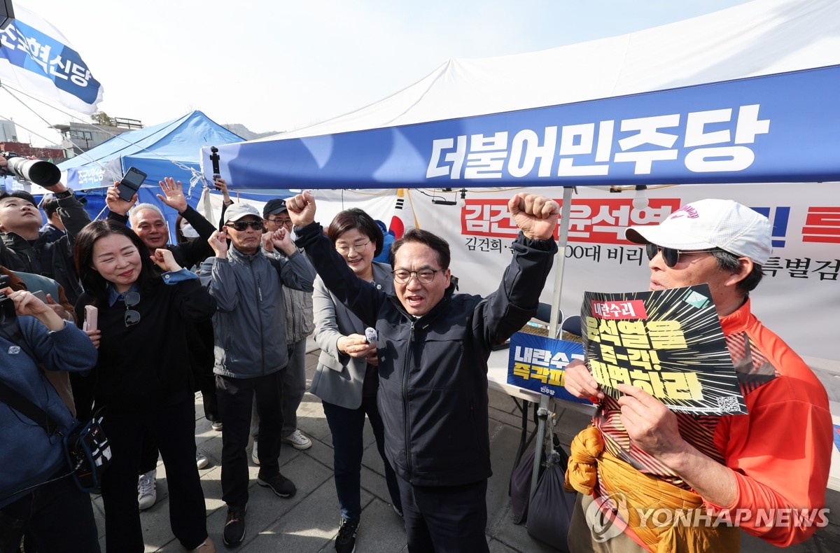 (서울=연합뉴스) 신현우 기자 = 26일 서울 광화문 더불어민주당 천막 당사에서 더불어민주당 박선원 의원이 이재명 대표 공직선거법 위반 혐의 항소심 무죄 소식을 들은 뒤 만세를 외치고 있다. 2025.3.26 nowwego@yna.co.kr