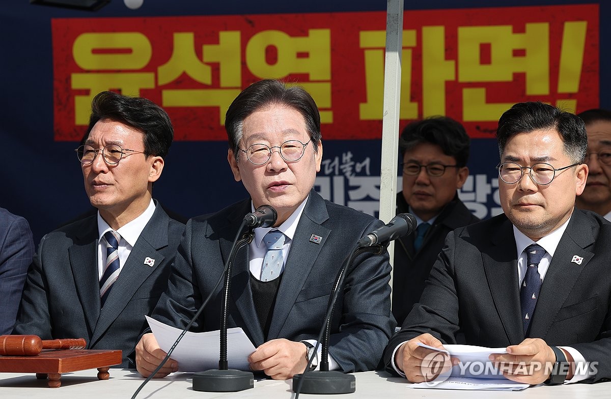 (서울=연합뉴스) 김성민 기자 = 더불어민주당 이재명 대표(가운데)가 26일 서울 종로구 광화문 천막당사에서 열린 최고위원회의에서 모두발언을 하고 있다. 2025.3.26 ksm7976@yna.co.kr