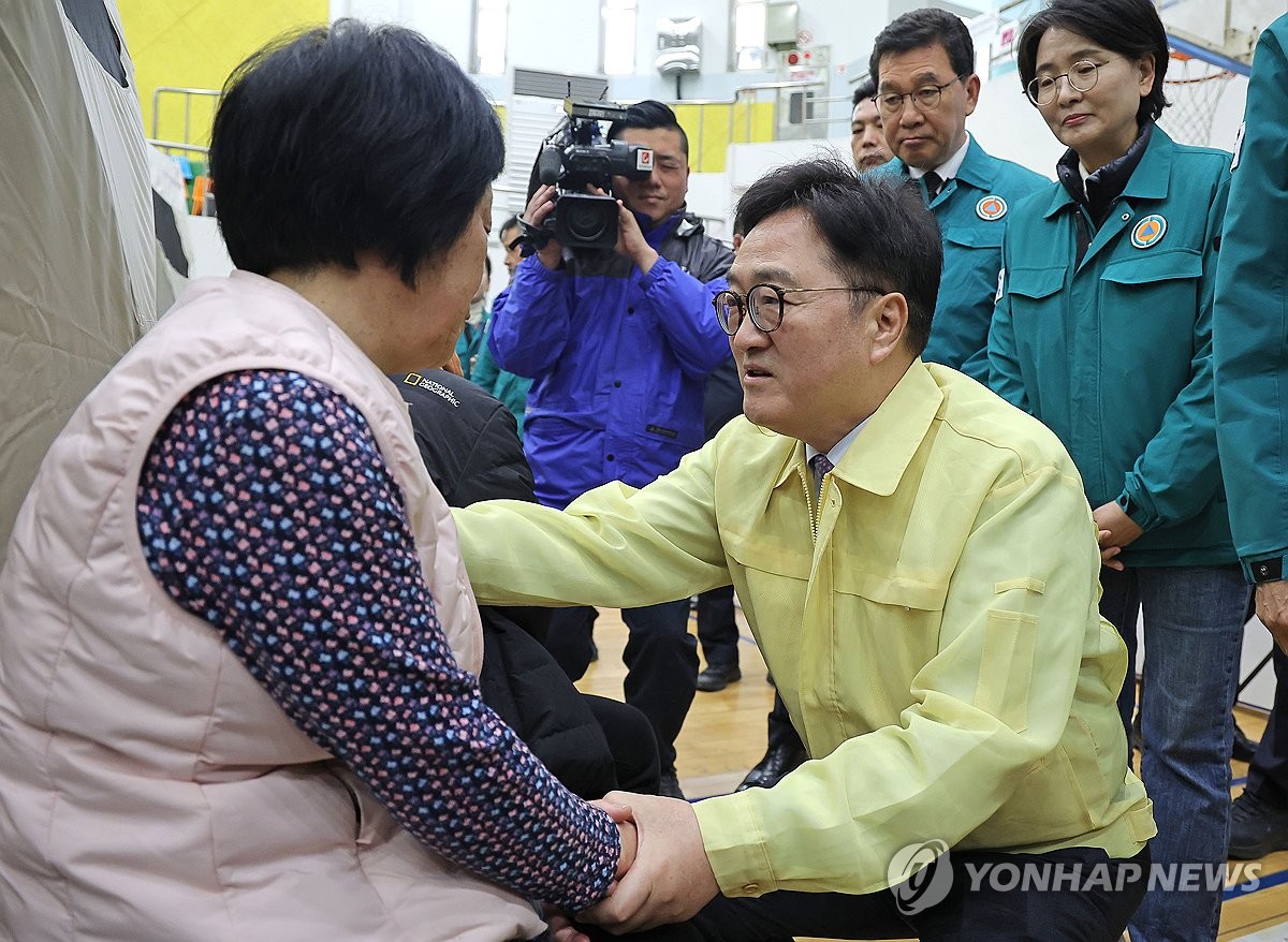 (의성=연합뉴스) 류영석 기자 = 우원식 국회의장이 28일 경북 의성군 의성읍 의성체육관에 마련된 산불 대피소를 찾아 이재민을 위로하고 있다. 2025.3.28 ondol@yna.co.kr