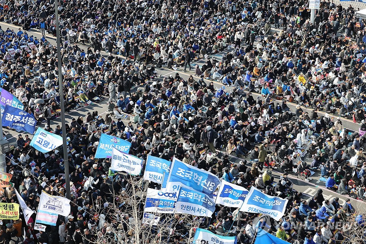 (서울=연합뉴스) 김영신 기자 = 더불어민주당을 비롯한 5개 야당은 주말인 29일 광화문에서 공동 집회를 열고 헌법재판소를 향해 윤석열 대통령에 대한 파면 선고를 조속히 내리라고 촉구했다.