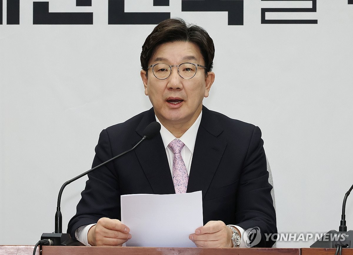 (서울=연합뉴스) 김주형 기자 = 국민의힘 권성동 원내대표가 8일 국회에서 열린 원내대책회의에서 발언하고 있다. 2025.4.8 kjhpress@yna.co.kr