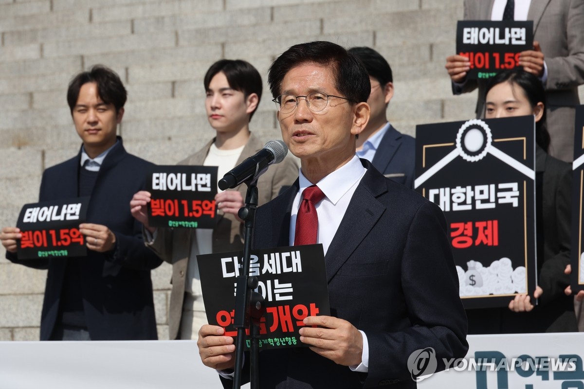 (서울=연합뉴스) 박동주 기자 = 대선 출마를 선언한 김문수 전 고용노동부 장관이 11일 서울 여의도 국회 본청 계단 앞에서 열린 연금개혁청년행동 주최 '연금개악 규탄 집회'에서 발언하고 있다. 2025.4.11 pdj6635@yna.co.kr