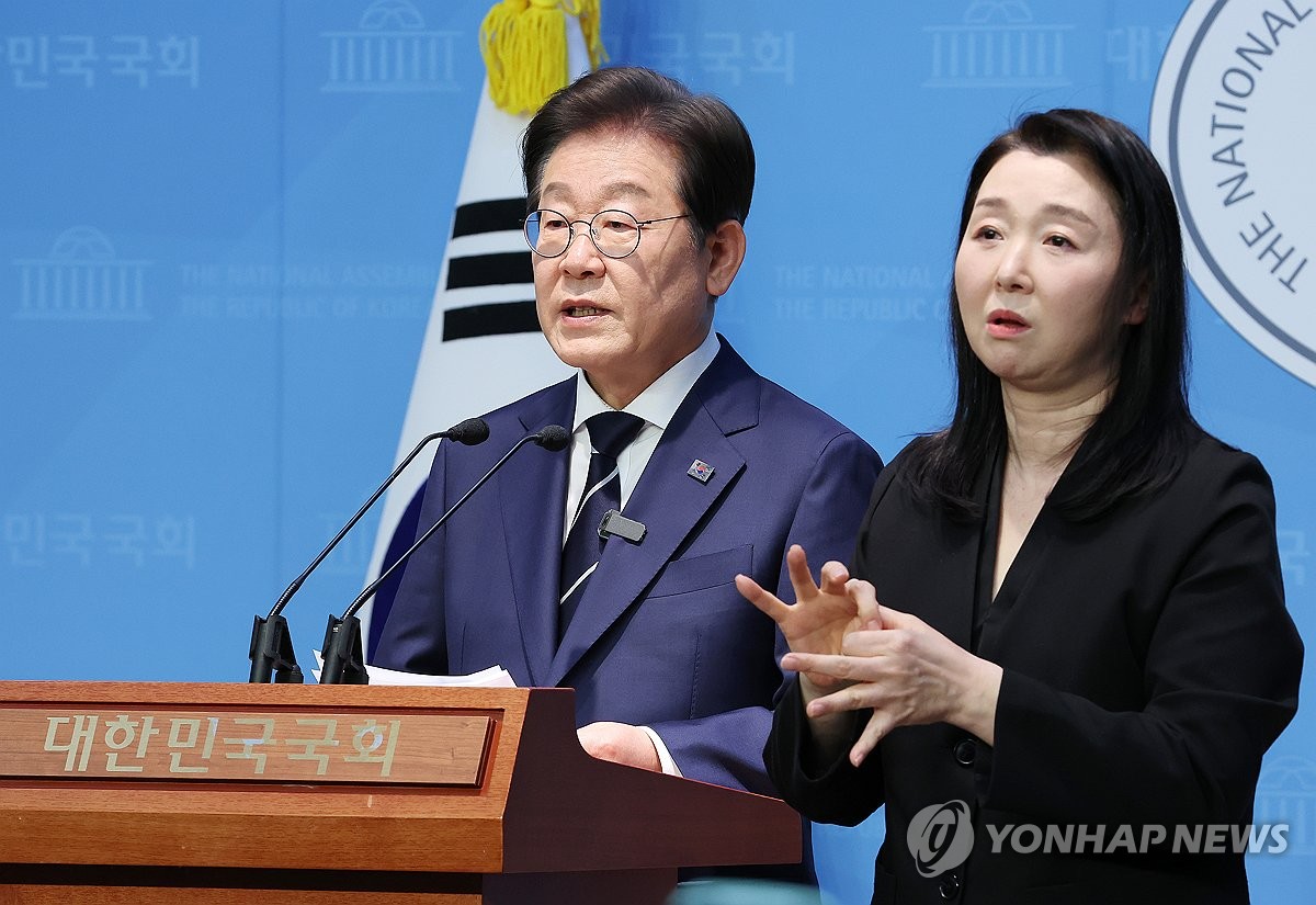 (서울=연합뉴스) 김주형 기자 = 더불어민주당 대선 경선에 출마한 이재명 예비후보가 11일 서울 여의도 국회 소통관에서 집권 청사진 등을 소개하는 '비전 선포식 및 캠프 일정 발표'를 하고 있다. 2025.4.11 kjhpress@yna.co.kr