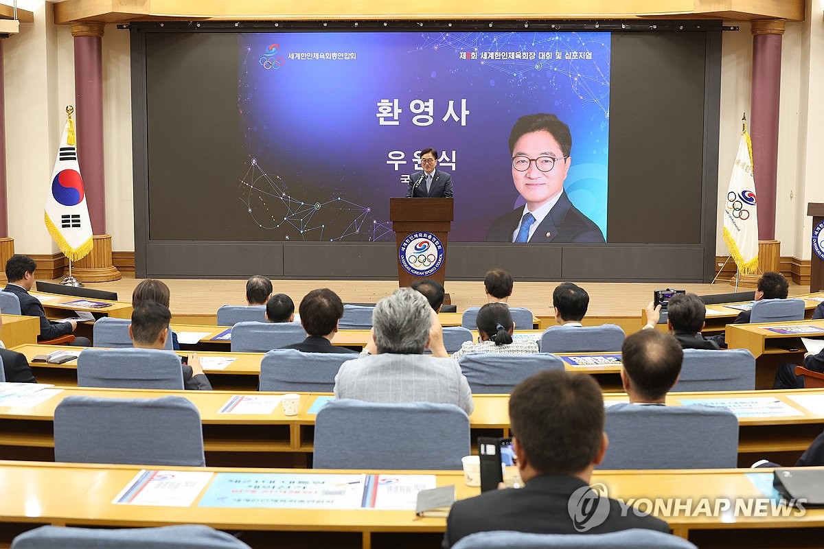 (서울=연합뉴스) 박동주 기자 = 우원식 국회의장이 21일 서울 여의도 국회 의원회관에서 열린 제9회 세계한인체육회장 대회 및 심포지엄에서 환영사를 하고 있다. 2025.4.21 pdj6635@yna.co.kr