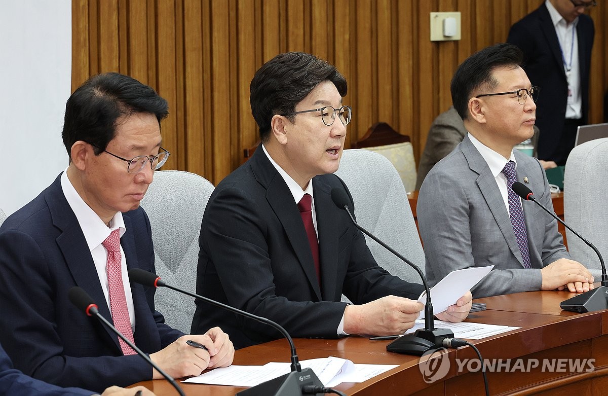 (서울=연합뉴스) 김주형 기자 = 국민의힘 권성동 원내대표(가운데)가 25일 국회에서 열린 원내대책회의에서 발언하고 있다. 2025.4.25 kjhpress@yna.co.kr