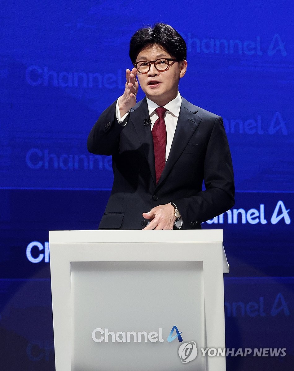 (서울=연합뉴스) 24일 서울 종로구 동아미디어센터 채널A 오픈스튜디오에서 국민의힘 대선 2차 경선 진출자인 한동훈 후보가 토론 전 리허설을 하고 있다. 2025.4.24 [국회사진기자단] photo@yna.co.kr