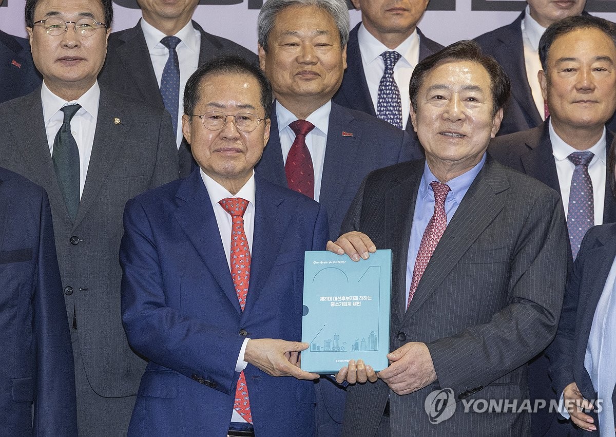 (서울=연합뉴스) 황광모 기자 = 홍준표 국민의힘 대선 후보가 28일 서울 여의도 중소기업중앙회를 방문해 중소기업들의 건의 사항이 담긴 제언서를 김기문 중기중앙회 회장에게 받고 있다. 2025.4.28 hkmpooh@yna.co.kr