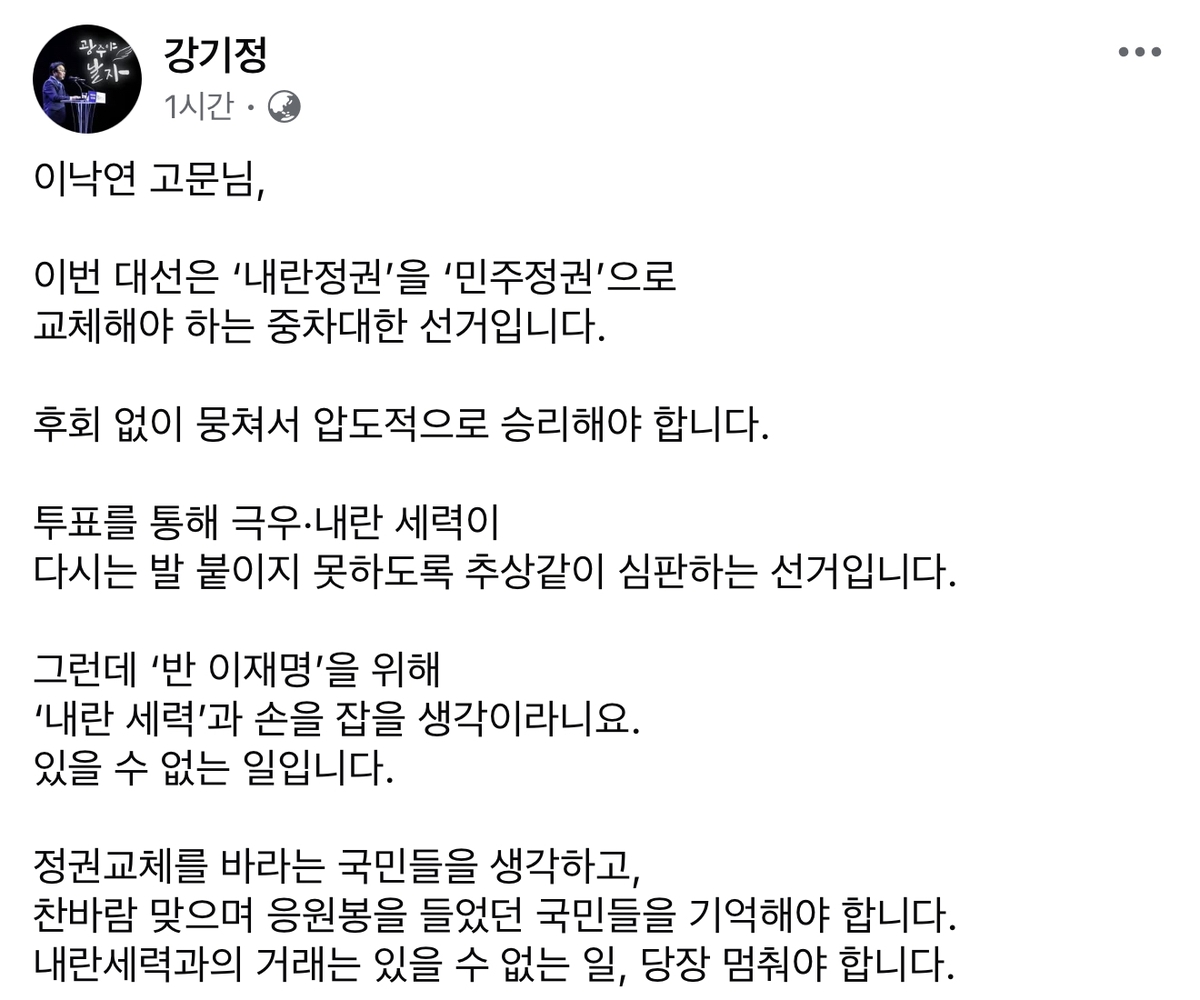 강 시장은 "이번 대선은 '내란정권'을 '민주정권'으로 교체해야 하는 중차대한 선거다"며 "정권교체를 바라는 국민들을 생각하고, 찬바람 맞으며 응원봉을 들었던 국민들을 기억한다면 내란 세력과의 거래는 있을 수 없는 일로 당장 멈춰야 한다"고 밝혔다.