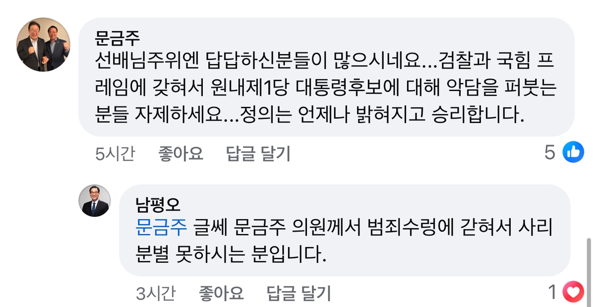 이에 문금주(전남 고흥·보성·장흥·강진) 민주당 의원은 "검찰과 국힘 프레임에 갇혀서 원내 제1당 대통령 후보에 대해 악담을 퍼붓는 분들 자제하세요"고 응수했다.