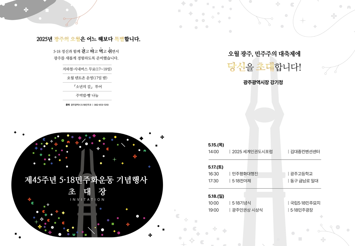 광주시는 초대장에서 지하철·시내버스 무료(17∼18일), 오월 텐트촌 운영(17일), 오월 주간에 열리는 세계인권도시포럼, 5·18 전야제, 민주평화대행진, 5·18기념식 등 다채로운 기념행사를 소개했다.