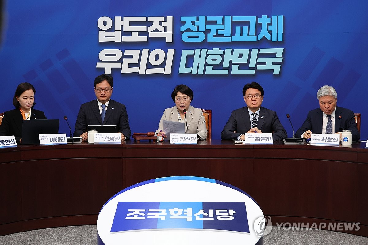 (서울=연합뉴스) 김주성 기자 = 조국혁신당 김선민 당대표 권한대행이 4월 7일 서울 여의도 국회에서 열린 최고위원회의에서 발언하고 있다. utzza@yna.co.kr