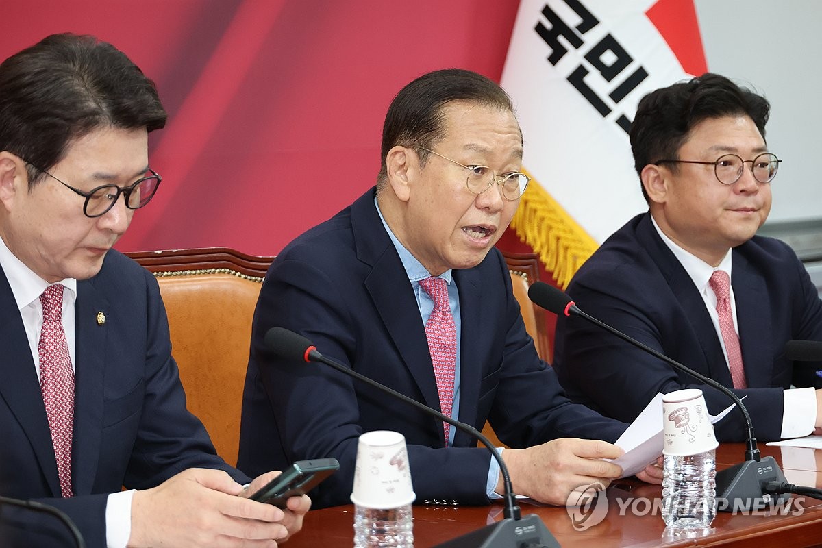 (서울=연합뉴스) 김주성 기자 = 국민의힘 권영세 비상대책위원장이 10일 서울 여의도 국회에서 사상 초유의 대선 후보 교체에 대한 입장을 밝히기 위해 기자회견 장소로 이동하고 있다. 오른쪽부터 강명구 비서실장, 권 비대위원장, 신동욱 수석대변인. 2025.5.10 utzza@yna.co.kr