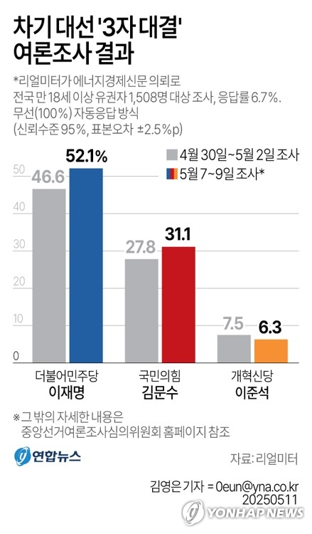 (서울=연합뉴스) 조다운 기자 = 더불어민주당 이재명, 국민의힘 김문수, 개혁신당 이준석 후보가 경쟁하는 차기 대선 '3자 대결' 구도에서 이재명 후보가 50% 넘는 지지율을 얻어 1위를 차지했다는 여론조사 결과가 11일 나왔다.