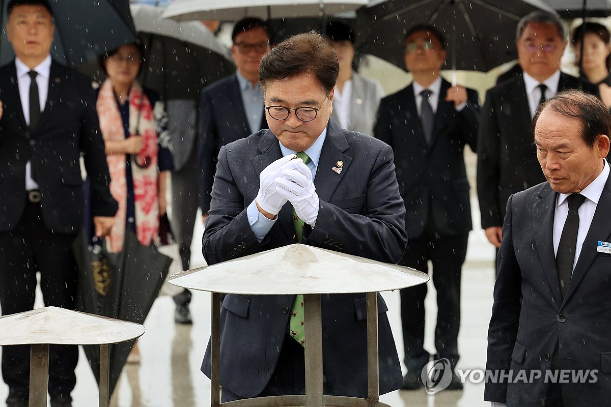 (광주=연합뉴스) 조남수 기자 = 우원식 국회의장이 16일 오후 광주 북구 국립5·18민주묘지를 찾아 참배하고 있다, 2025.5.16 iso64@yna.co.kr