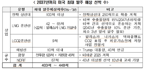 보고서는 트럼프 행정부가 강력한 드라이브를 걸고 있는 조선산업 재건 정책에 따라 미국이 오는 2037년까지 상선과 액화천연가스(LNG) 운반선, 해군 군함 등 최소 403척∼최대 448척의 선박을 발주할 것으로 전망했다.