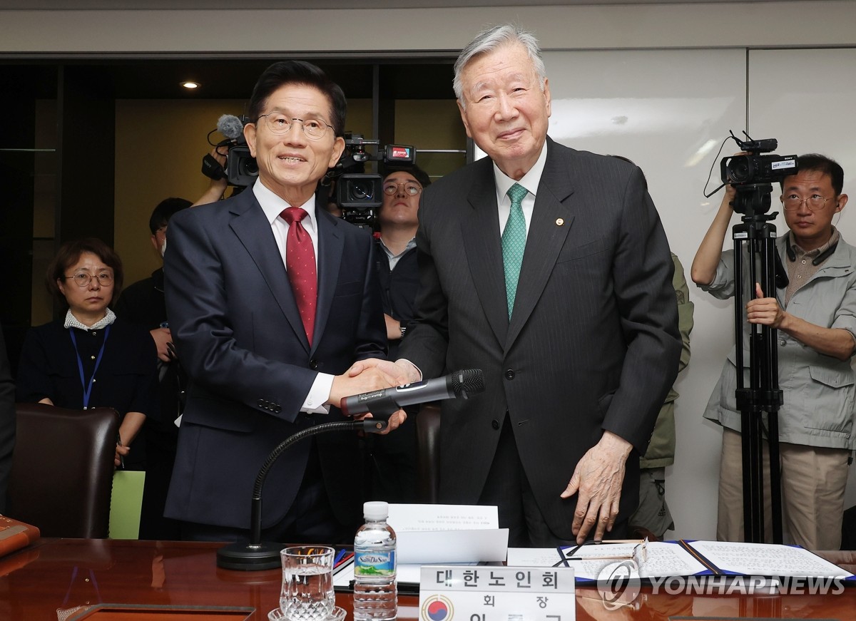 (서울=연합뉴스) 류영석 기자 = 국민의힘 김문수 대선 후보가 19일 서울 중구 부영 태평빌딩에서 열린 대한노인회 간담회에 참석해 이중근 노인회장과 악수를 나누고 있다. 2025.5.19 ondol@yna.co.kr