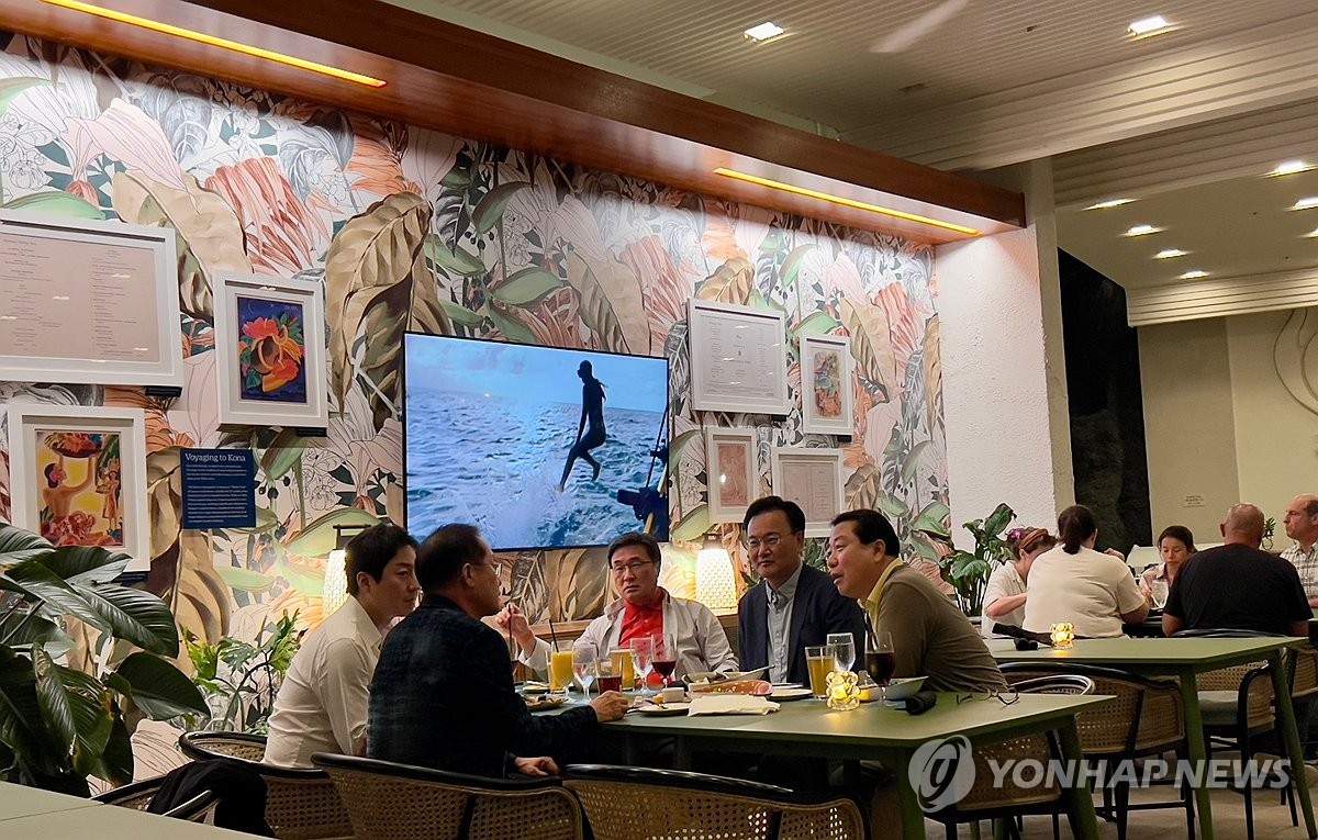 (서울=연합뉴스) 국민의힘 대선 선대위 유상범 단일화추진본부장, 김대식 대외협력본부장, 조광한 대외협력부본부장, 이성배 선대위 대변인이 19일 홍준표 전 대구시장의 선대위 합류를 설득하기 위해 미국 하와이에 도착, 홍 전 시장을 만나고 있다. 2025.5.19 [이성배 대변인 제공. 재판매 및 DB금지] photo@yna.co.kr