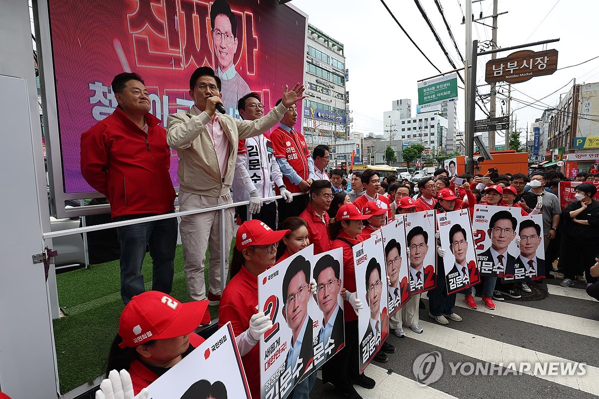 (서울=연합뉴스) 박동주 기자 = 국민의힘 김문수 대선 후보가 20일 서울 강서구 남부골목시장을 방문, 유세하고 있다. 2025.5.20 [공동취재] pdj6635@yna.co.kr