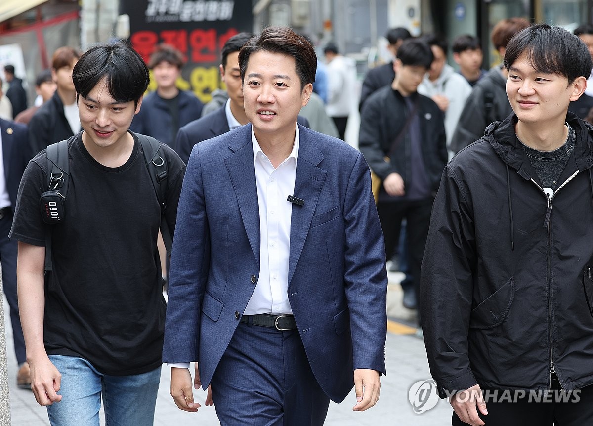 (서울=연합뉴스) 서명곤 기자 = 개혁신당 이준석 대선 후보가 24일 서울 동작구 노량진 한 한식 뷔페식당으로 향하고 있다. 2025.5.24