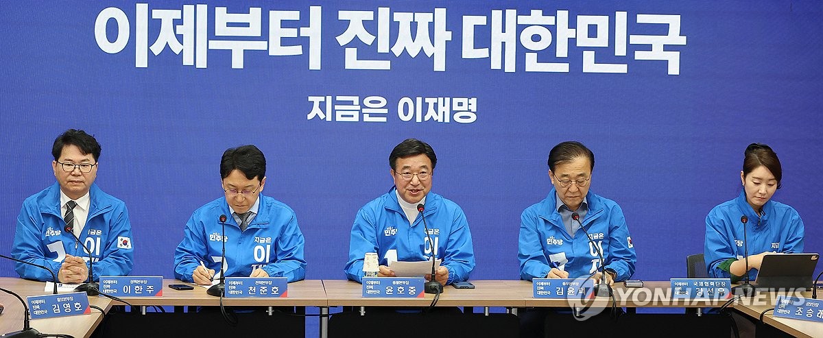 (서울=연합뉴스) 김주형 기자 = 더불어민주당 윤호중 선대위총괄본부장(가운데)이 27일 서울 여의도 중앙당사에서 열린 총괄본부장단회의에서 발언하고 있다. 2025.5.27 kjhpress@yna.co.kr