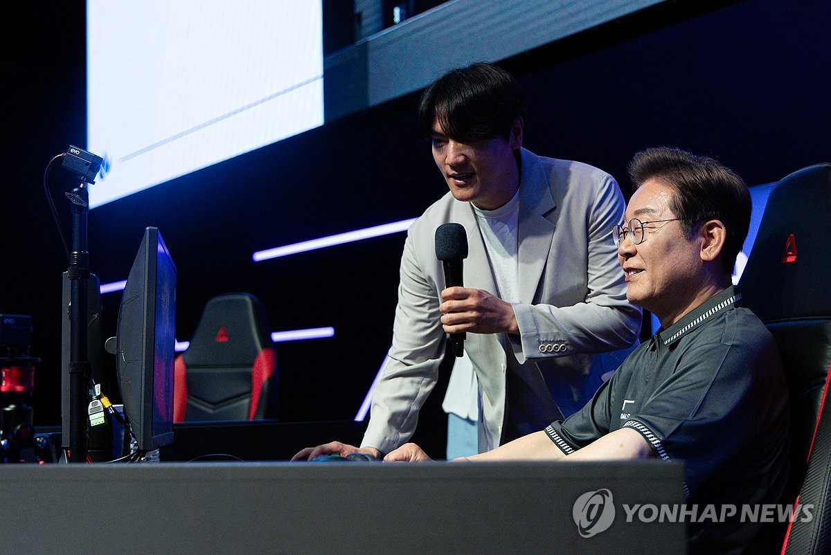 (광주=연합뉴스) 황광모 기자 = 이재명 더불어민주당 대통령 후보가 지난 17일 오후 광주 동구 조선대학교에 위치한 광주이스포츠경기장에서 열린 'K-콘텐츠 e스포츠 LEVEL UP!' e스포츠 산업 현장간담회에서 게임 '리그오브레전드'를 체험하고 있다. 2025.5.17 [공동 취재] hkmpooh@yna.co.kr