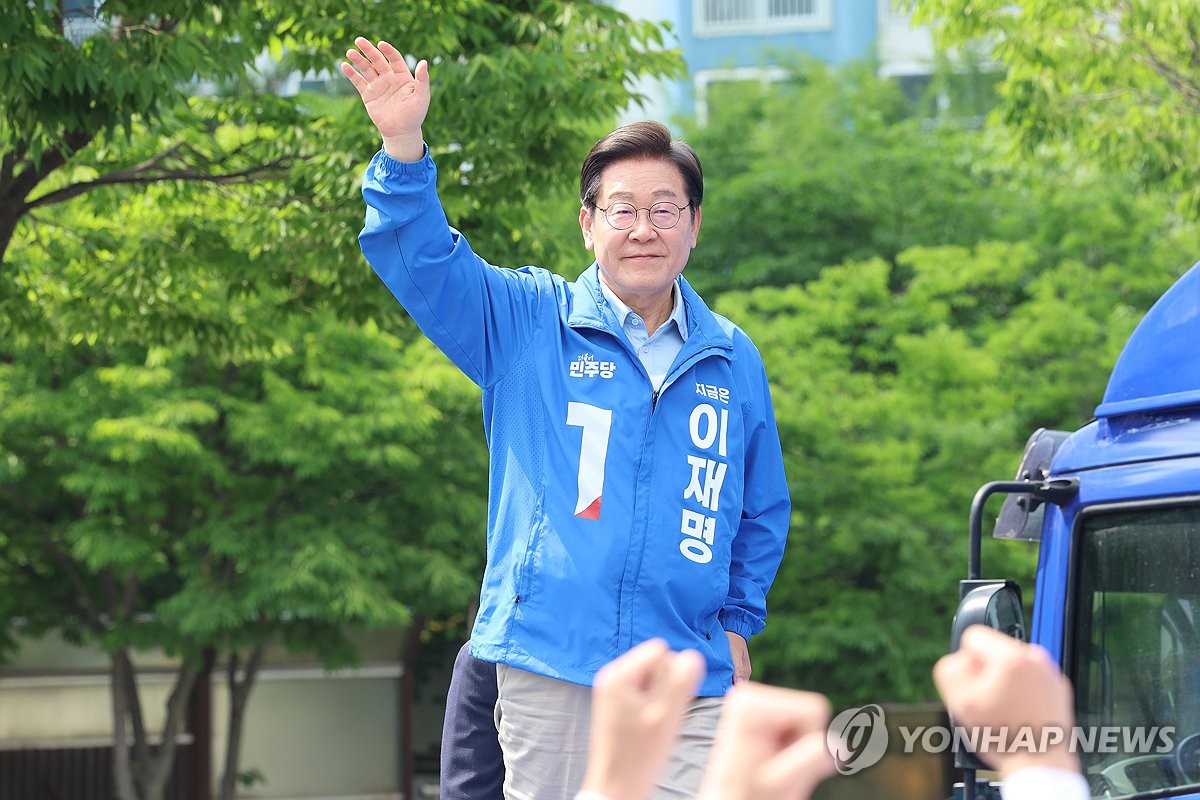 (용인=연합뉴스) 김주성 기자 = 더불어민주당 이재명 대선 후보가 26일 용인시 수지구 단국대 죽전캠퍼스 앞에서 열린 유세에서 시민들에게 인사하고 있다. 2025.5.26 utzza@yna.co.kr