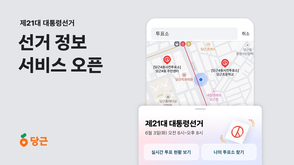 (서울=연합뉴스) 김현수 기자 = 지역생활 커뮤니티 당근은 제21대 대통령 선거를 앞두고 후보자 공약, 투표소 위치, 동네 투표율 등을 확인할 수 있는 서비스를 시작한다고 28일 밝혔다.