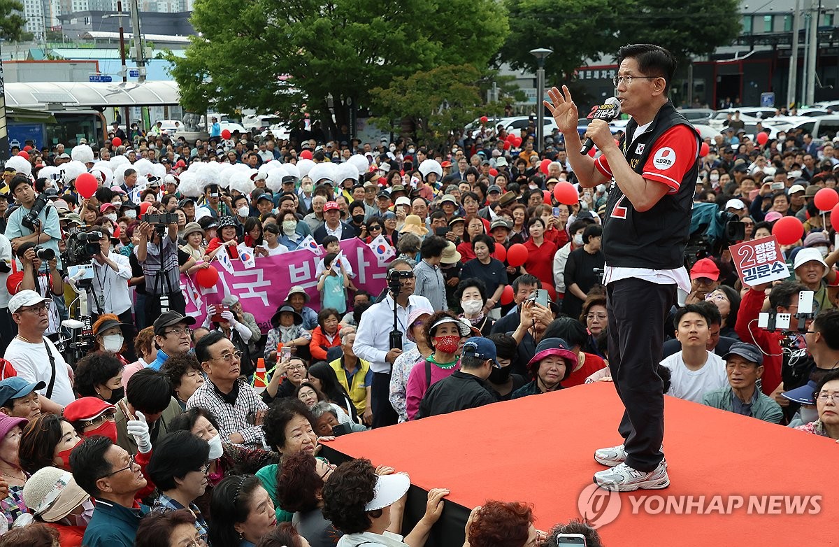 (영천=연합뉴스) 윤관식 기자 = 국민의힘 김문수 대선 후보가 28일 경북 영천역 광장에서 유세하고 있다. 2025.5.28 psik@yna.co.kr