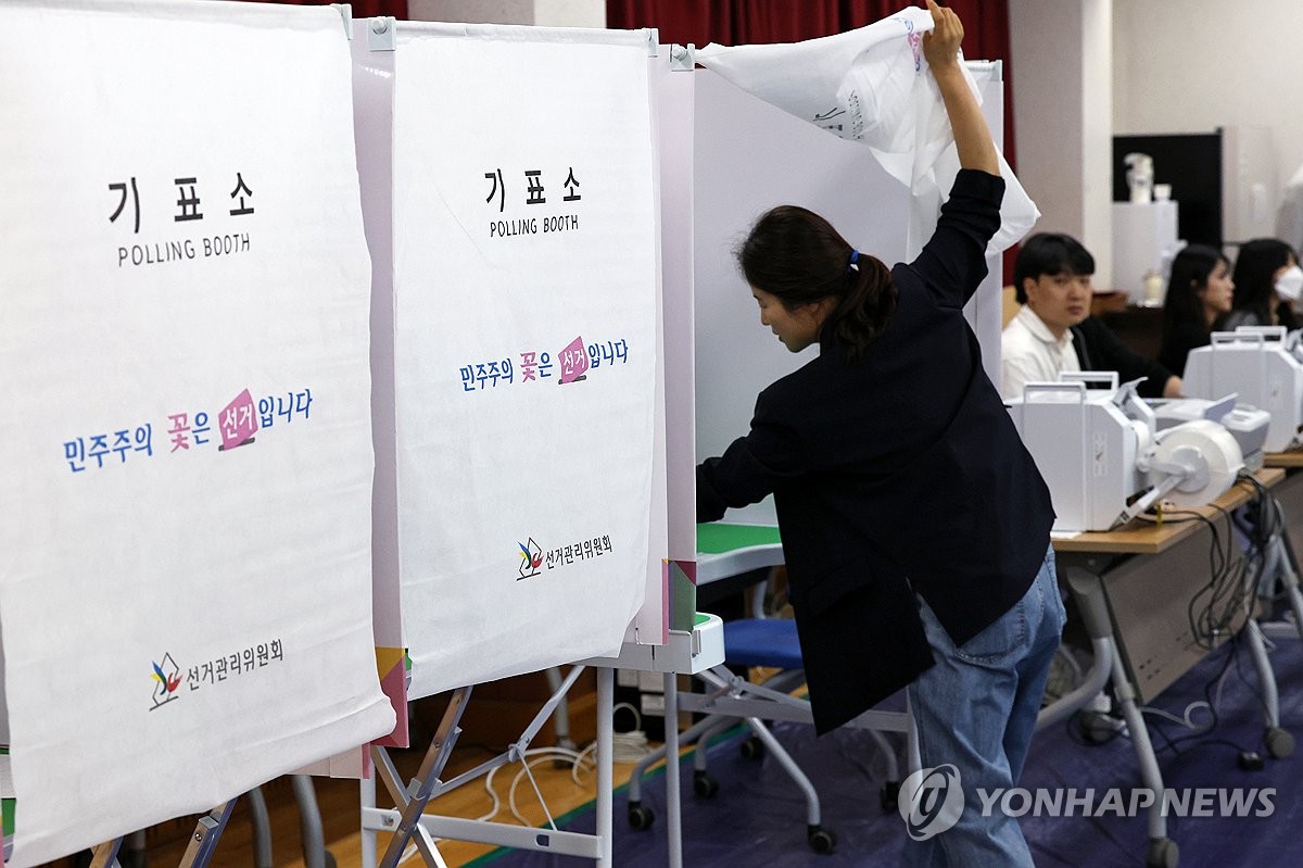 (광주=연합뉴스) 조남수 기자 = 제21대 대통령선거 사전투표를 하루 앞둔 28일 광주 동구 지원2동 행정복지센터에 마련된 사전투표소에서 선관위 관계자가 투표 설비를 점검하고 있다. 2025.5.28 iso64@yna.co.kr