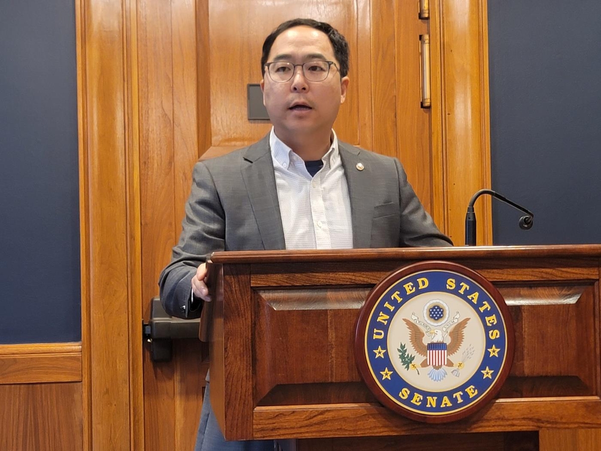 (워싱턴=연합뉴스) 조준형 특파원 = 한국계로는 사상 처음 미국 연방 상원에 진출한 앤디 김 상원의원이 28일(현지시간) 워싱턴 DC의 미국 의회 건물에서 열린 한국 언론과의 간담회에서 발언하고 있다. 2025.5.29 jhcho@yna.co.kr