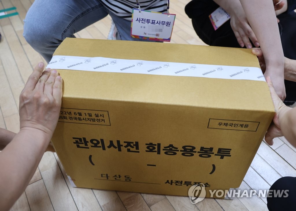 (서울=연합뉴스) 2022년 5월 27일 중구 다산동 사전투표소에서 투표 종료 후 관계자들이 회송용 봉투에 담긴 관외 투표용지를 정리하고 있고 있는 모습. 2022.5.27 [연합뉴스 자료사진. 재판매 및 DB 금지]