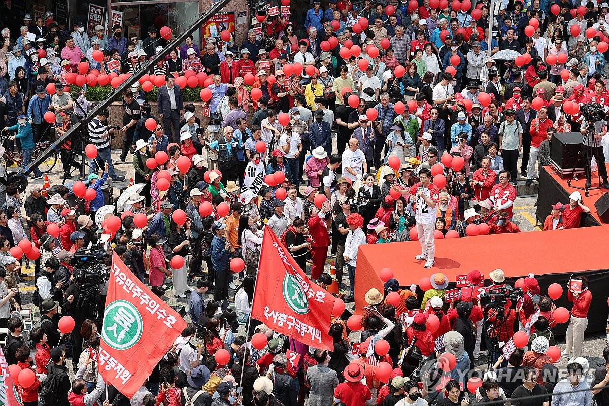 (이천=연합뉴스) 박동주 기자 = 국민의힘 김문수 대선 후보가 30일 경기 이천시산림조합 앞 중리사거리에서 열린 유세에서 지지를 호소하고 있다. 2025.5.30 pdj6635@yna.co.kr