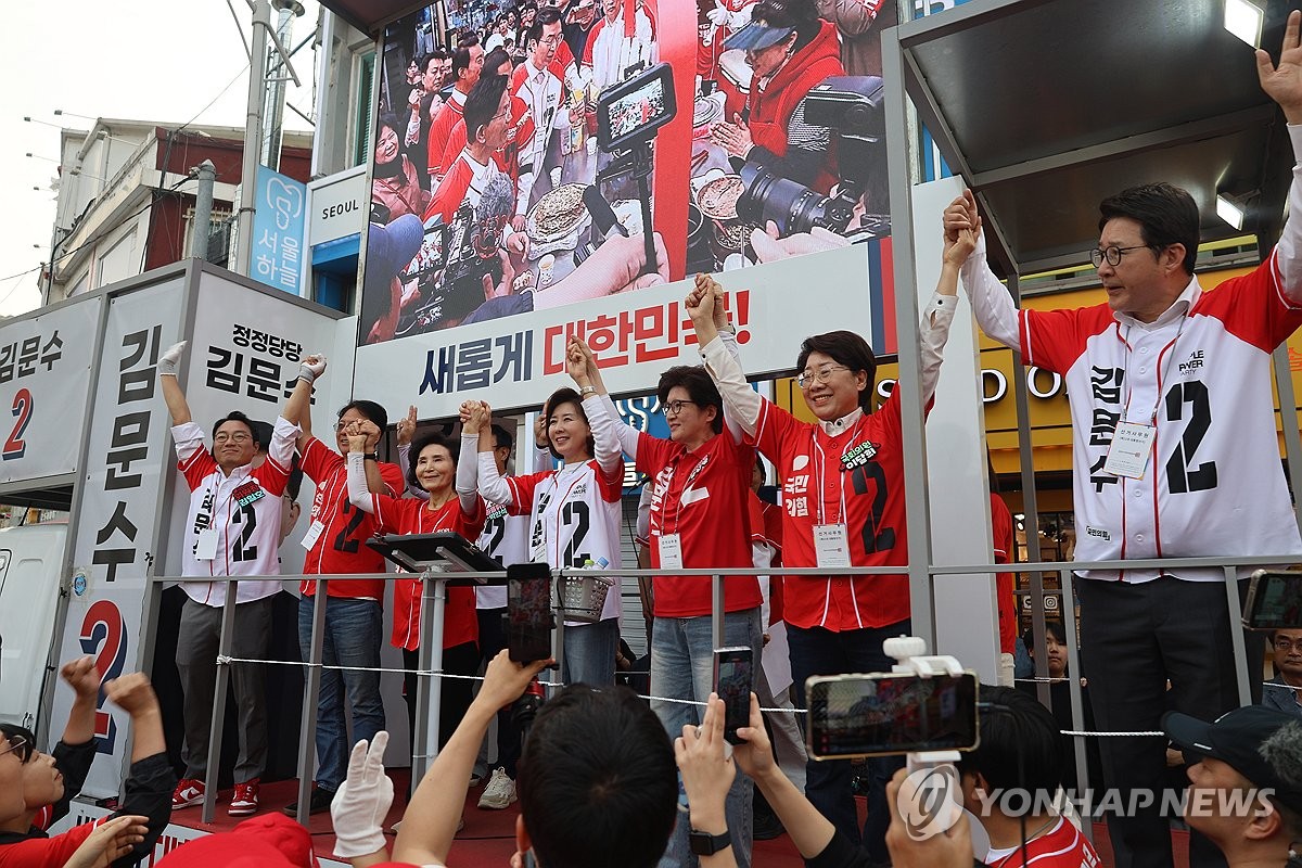 ▲김 후보의 부인 설난영 여사는 이날부터 서울 은평구 대림골목시장, 마포구 망원시장 등에서 시민들과 인사하고 영등포구 타임스퀘어와 동작구 중앙대병원 앞 광장에서 열린 서울시선대위 거점 유세에 참석하는 등 측면 지원을 펼쳤다. 설 여사 일정에는 나경원·안철수 공동선대위원장 등이 동행했다.