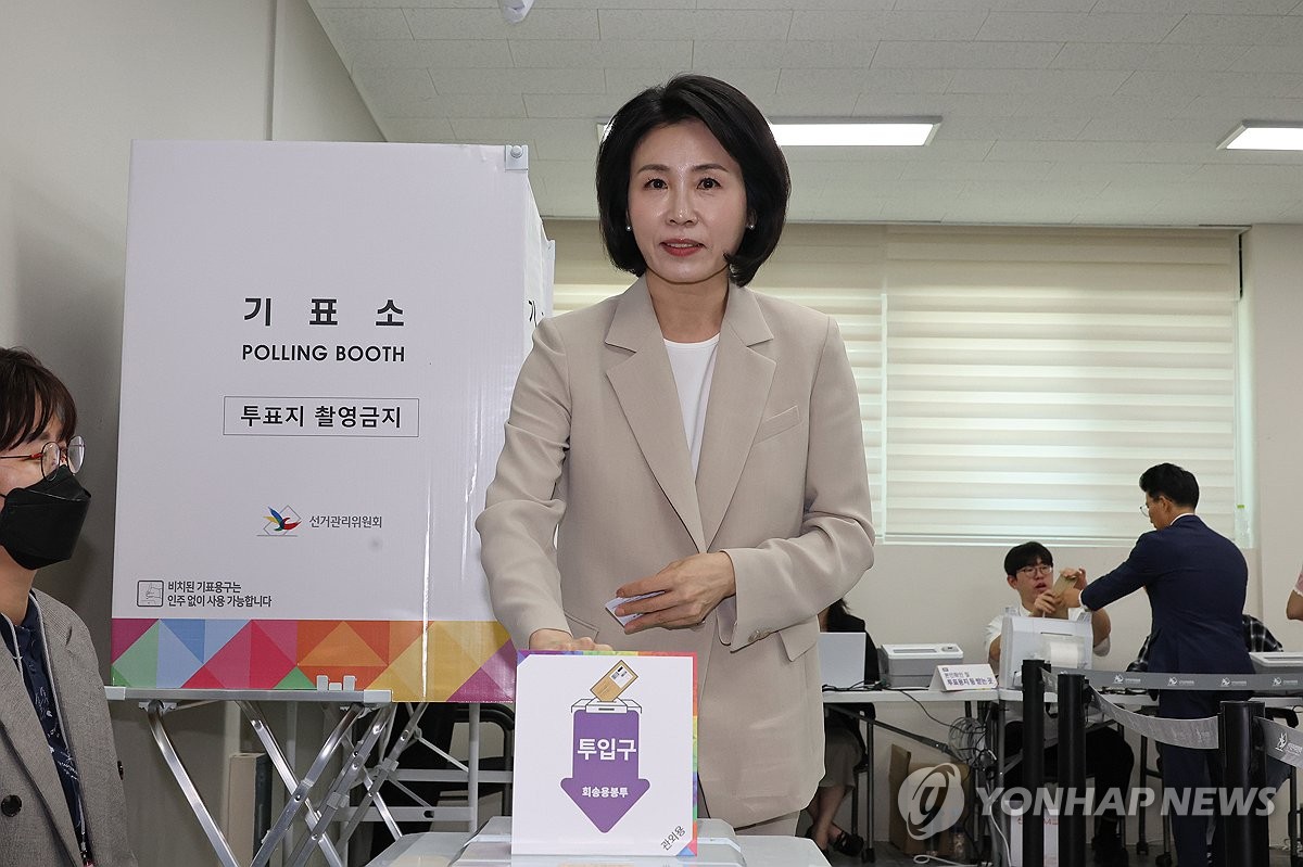 (부산=연합뉴스) 이진욱 기자 = 제21대 대통령선거 사전투표가 시작된 29일 더불어민주당 이재명 대선 후보의 배우자 김혜경 여사가 부산시 동구 초량2동 행정복지센터에 마련된 사전투표소에서 투표하고 있다. 2025.5.29 cityboy@yna.co.kr