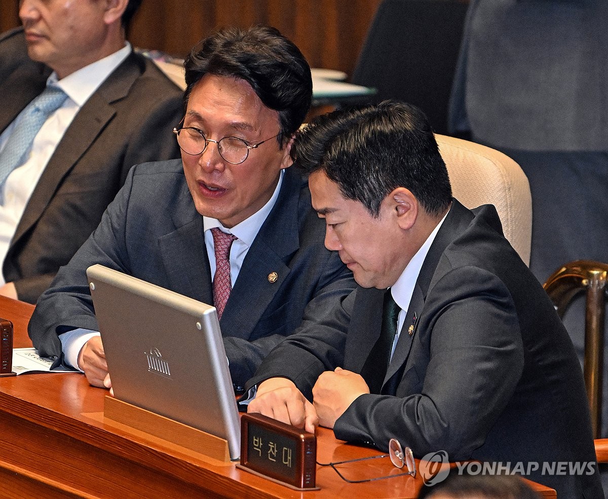 (서울=연합뉴스) 더불어민주당 박찬대 당대표 직무대행 겸 원내대표(오른쪽)와 김민석 최고위원이 24일 서울 여의도 국회 본회의장에서 한덕수 대통령 권한대행 국무총리의 추가경정예산안 시정연설 때 논의하고 있다. 2025.4.24 [국회사진기자단] photo@yna.co.kr