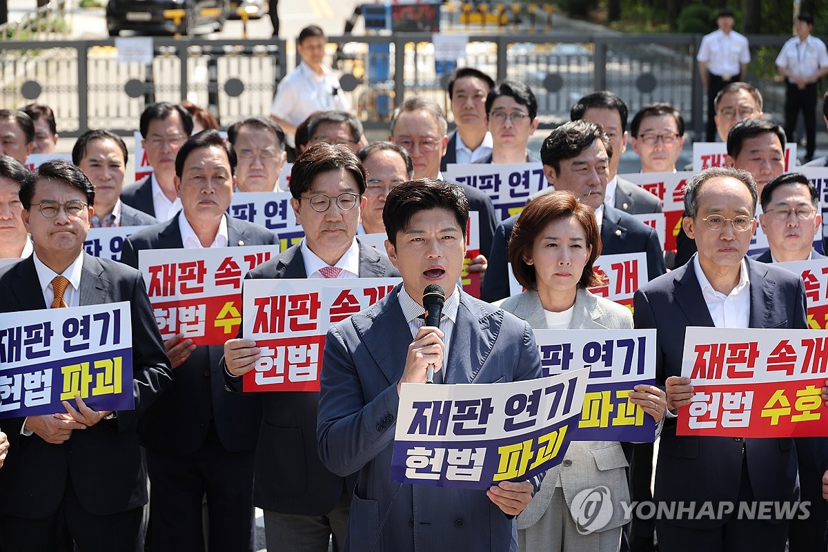 윤상현 의원도 이 대통령 관련 재판 연기가 "정치권력에 사법부가 무릎 꿇고 정치적 면죄부를 주면서 법 앞에 권력이 있다는 걸 선언한 것"이라며 "(사법부는) 이재명 괴물 독재 국가의 공범이 된다는 걸 기억하라"고 비난했다.
