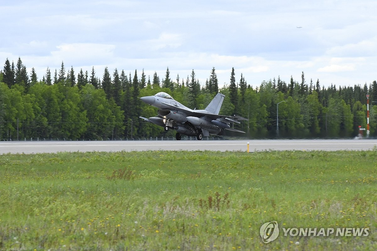 (서울=연합뉴스) 레드플래그 훈련 참가를 위해 공군 충주기지에서 출발한 KF-16이 4일(현지시간) 미국 알래스카주 아일슨 기지에 착륙하고 있다. 2025.6.5 [공군 제공. 재판매 및 DB 금지] photo@yna.co.kr
