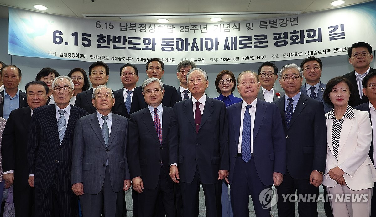 (서울=연합뉴스) 김성민 기자 = 김대중평화센터가 12일 서울 마포구 연세대학교 김대중도서관에서 연 6.15 남북정상회담 25주년 기념식에서 참가자들이 기념 촬영을 하고 있다. 2025.6.12 ksm7976@yna.co.kr