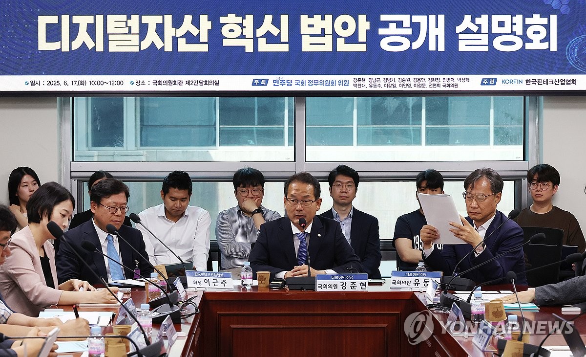 (서울=연합뉴스) 김주형 기자 = 17일 서울 여의도 국회 의원회관에서 더불어민주당 국회정무위원회 위원들이 주최하고 한국핀테크산업협회가 주관해 열린 '디지털자산 혁신 법안 공개 설명회'에서 강준현 의원이 발언하고 있다. 2025.6.17 kjhpress@yna.co.kr