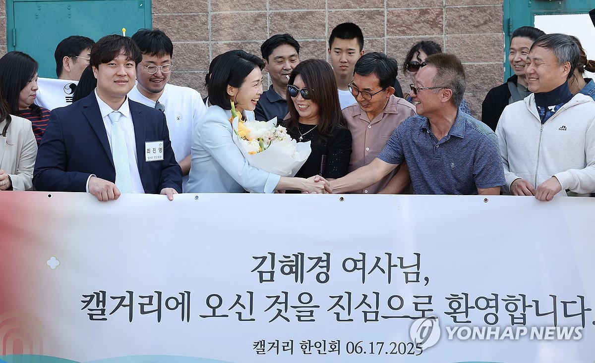 (캘거리[캐나다]=연합뉴스) 한상균 기자 = G7 정상회의에 참석하는 이재명 대통령과 함께 캐나다를 방문한 김혜경 여사가 17일(현지시간) 캘거리 한인회관에서 캐나다 서부 동포사회와의 대화 참석 전 환영 나온 교포들과 인사하고 있다. 2025.6.18 xyz@yna.co.kr
