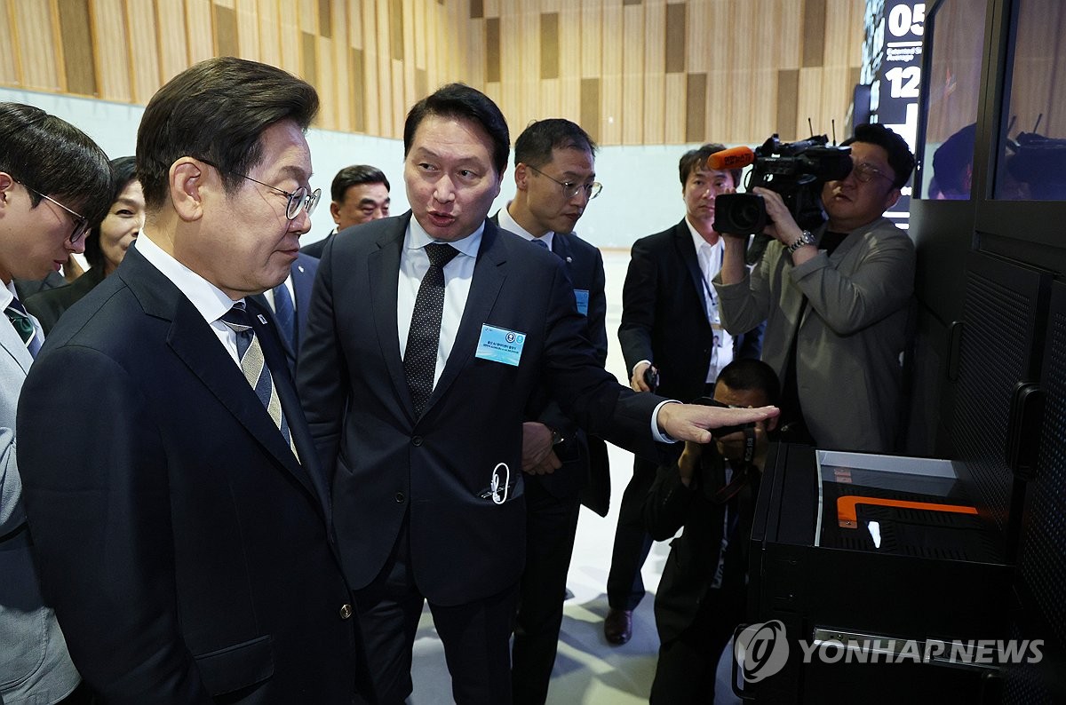 (울산=연합뉴스) 홍해인 기자 = 이재명 대통령이 20일 울산전시컨벤션센터에서 열린 인공지능(AI) 글로벌 협력 기업 간담회 뒤 AI 제품·서비스 시연을 참관하며 최태원 SK그룹 회장의 설명을 듣고 있다. 2025.6.20 [대통령실통신사진기자단] hihong@yna.co.kr
