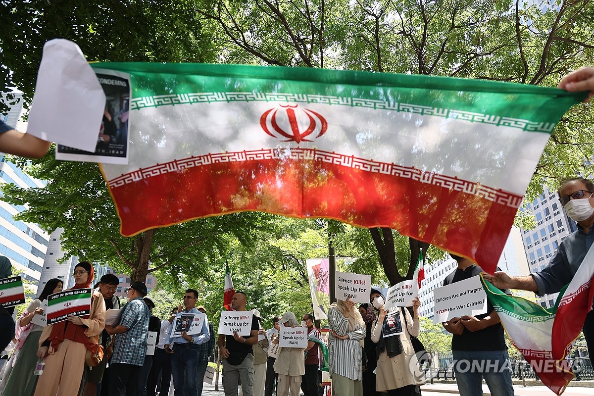 (서울=연합뉴스) 윤동진 기자 = 미국이 군사력을 활용해 이란의 핵 시설을 직접 타격한 지난 22일 서울 종로구 SK서린빌딩 인근에서 재한이란인들을 비롯한 참석자들이 이란-이스라엘 휴전을 촉구하는 집회를 열고 있다. 2025.6.22 mon@yna.co.kr