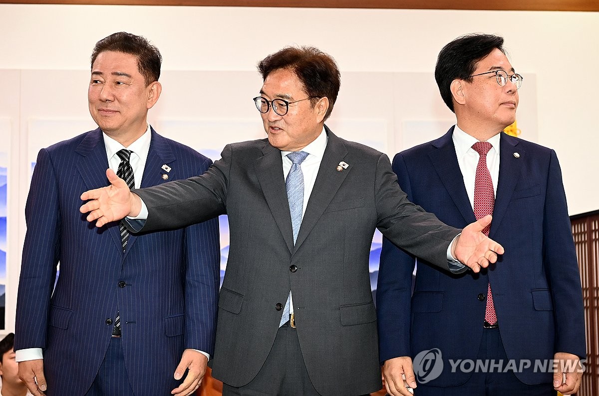 왼쪽부터 더불어민주당 김병기 당 대표 직무대행 겸 원내대표, 우원식 국회의장, 국민의힘 송언석 원내대표. 2025.6.24 [공동취재] kjhpress@yna.co.kr